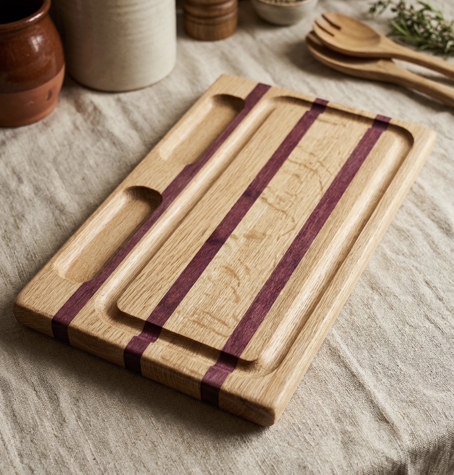 • שילוב עץ יוקרתי: הלוח עשוי מעץ אלון בהיר וחזק בשילוב פסי עץ פורפל הארט – עץ אקזוטי בעל גוון סגול טבעי ועמוק (ללא צבע או כימיקלים).